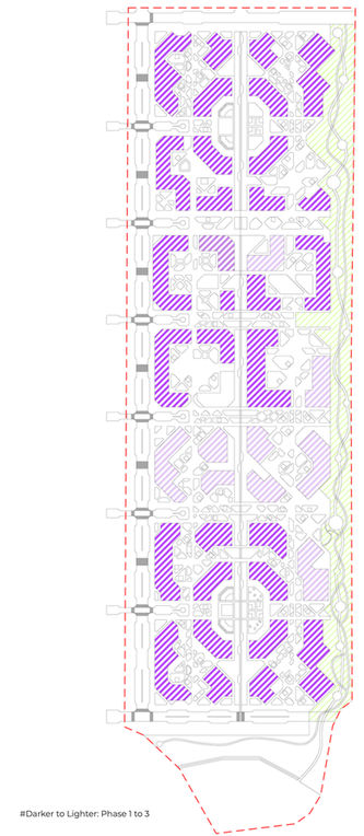 The diagrams illustrate a master plan shaped by a central spine, green corridors, and defined movement routes. Activity zones and mixed-use edges animate the streets, balancing livability, access, and sustainability.